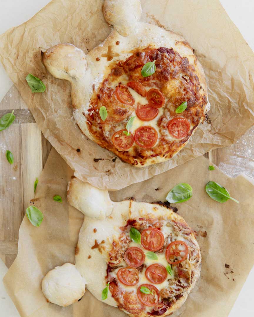 Divide the pizza dough into two ½ cup size portions, and then with the remaining dough, divide into 6 little pieces.