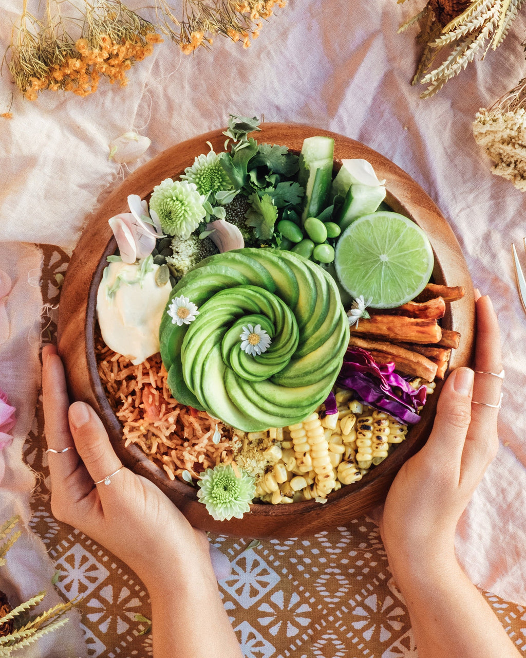 This dish is an absolute feast and best enjoyed with friends (and a cheeky sangria!). Extra nourishing and delicious cooked in Chicken Bone Broth (if you'd like to make this recipe vegan, use our Vegetable Broth instead). The vegan lime cashew aioli brings is all together and is so moreish, you'll want to drizzle it over everything! You can take your entertainers game up a level by crowning the bowl with an avocado rose by following the steps below, but this step is just for added cuteness and creativity, a simple sliced avo works just as well!